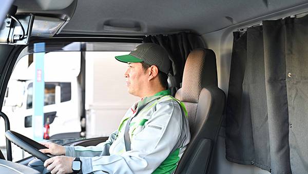 午後の配送先へ出発し、納品を行います。「隣接確認ヨシ!」天候や道路状況に気を配り、安全第一で運行。渋滞で定刻に遅れそうなときは管理者へ報告します。