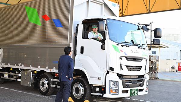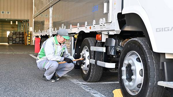運転席、車両周り(油漏れ)、エンジンルームなど日々の日常点検を実施。日常点検で異常がないことを確認し、配送先へ向けて出発。「今日も一日ご安全に!」