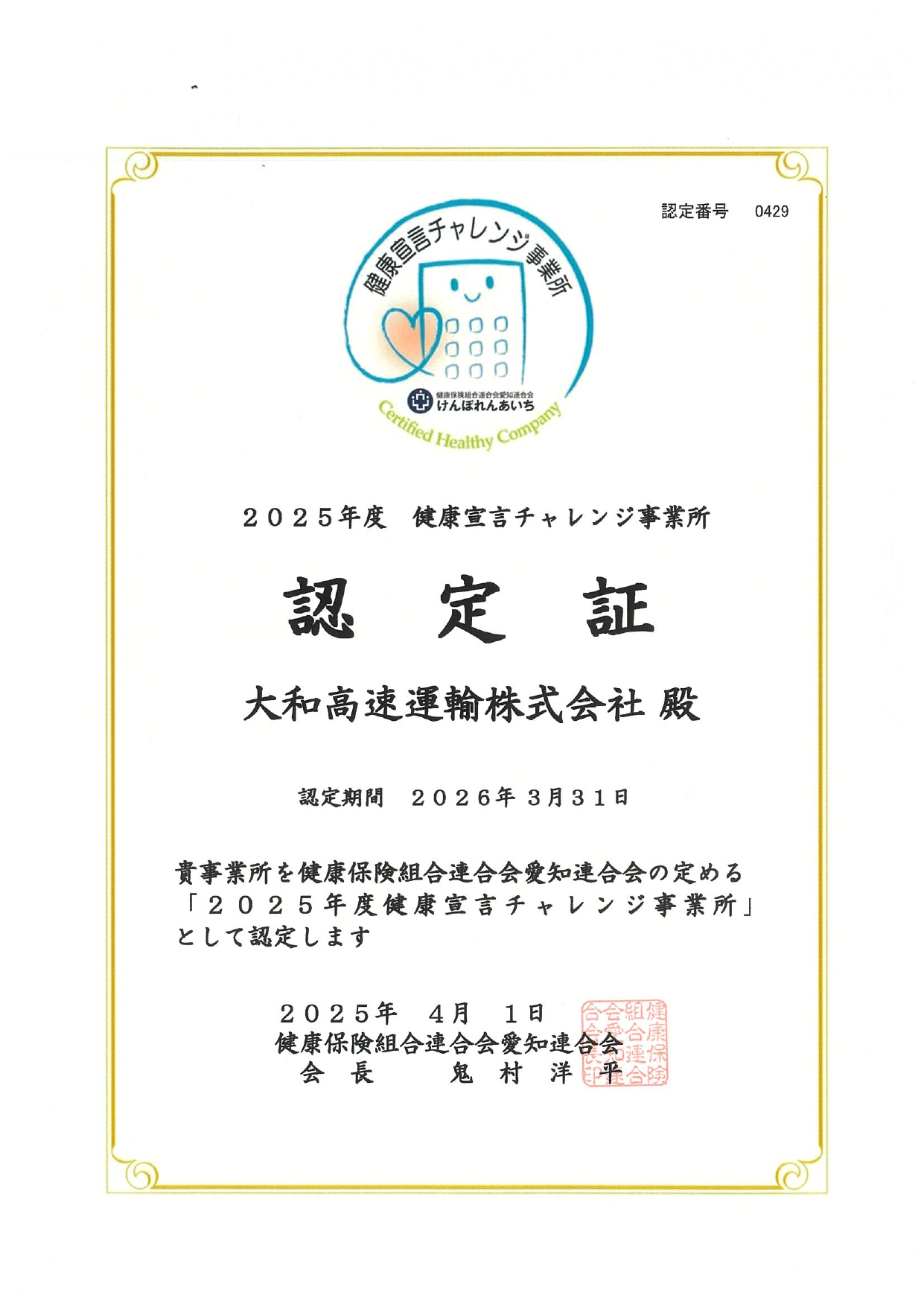 2023年度 健康宣言チャレンジ事業所認定証