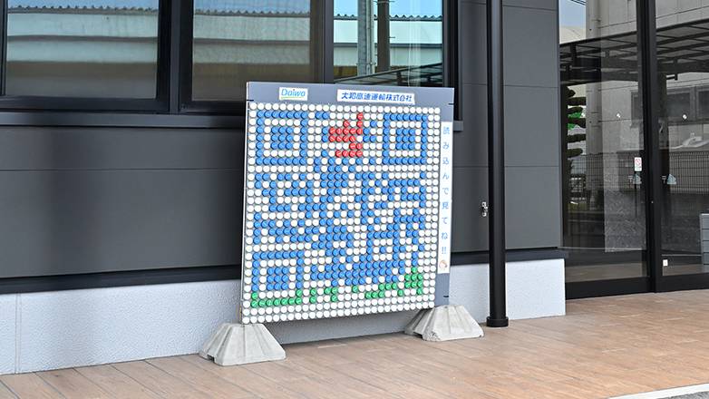当社ではSDGs活動の一環として、ペットボトルキャップを回収し、認定NPO法人JCVを通じて世界の子どもたちへワクチンを届ける取り組みを行っています。社屋玄関には、回収のシンボルとしてキャップで制作したオブジェを設置しています。